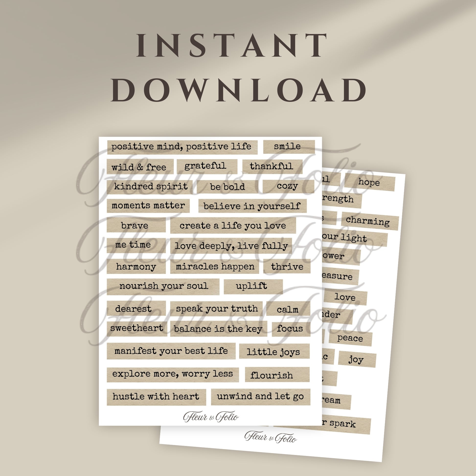 Elevate your journals with this collection of positive and uplifting printable words and sayings! Whether you're crafting a vintage-inspired spread, adding thoughtful sentiments to your scrapbook, or layering mixed media elements, these printable ephemera pieces bring personality and charm to every project.